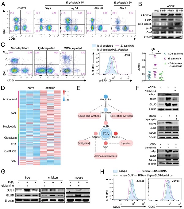 为了解析鱼类T细胞免疫的调控机制,作者进行了转录组学分析。结果显示,罗非鱼使用了与哺乳动物相似的转录调控网络支持T细胞免疫;而病原感染罗非鱼后,T细胞的差异表达基因主要富集于代谢通路,且发生了大规模的代谢重编程。由于重编程的代谢程序均直接或间接溯源至谷氨酰胺分解代谢,作者进而探讨了谷氨酰胺代谢对罗非鱼T细胞免疫的调控。活化的罗非鱼T细胞增加了谷氨酰胺的利用;而谷氨酰胺剥夺或谷氨酰胺酶GLS1的抑制,造成了T细胞增殖和效应功能的障碍。进一步的研究证实,mTORC1和MAPK/ERK通路承接了TCR信号,通过c-Myc调控谷氨酰胺代谢,并促进罗非鱼T细胞免疫。