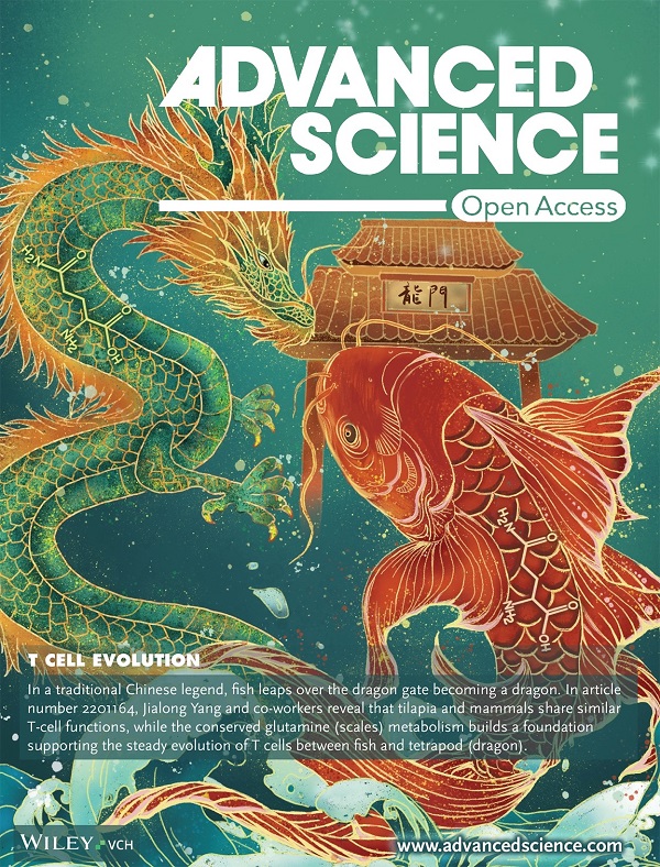 综上所述,该研究验证了T细胞免疫稳定进化的假说,并提出保守的转录调控网络和代谢程序,尤其是谷氨酰胺分解代谢,是硬骨鱼与四足动物之间T细胞功能相似性的分子基础。该研究被选为Advanced Science的卷首文章。
