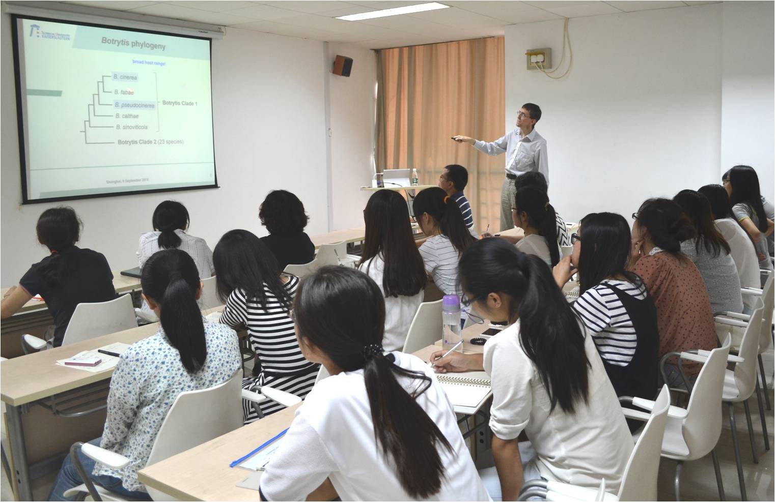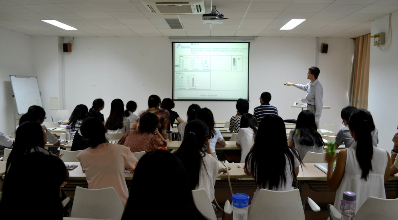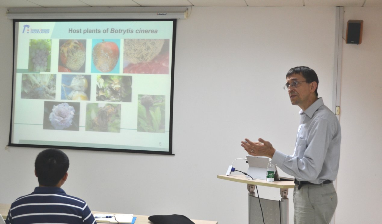 Hahn教授此次学术报告的题目为"Exploring the mechanisms of plant infection by the grey mould fungus Botrytis cinerea"。报告主要阐述了近年来他的科研团队在重要植物病害灰霉菌(Botrytis cinerea)领域最新的研究进展,并从分子遗传学角度研究灰霉菌种群基因异构,以及不同的基因型对寄主表现出的不同表达程度的适应。报告内容主要从灰霉菌基因的多样性,BMP1 MAP激酶级联和质膜传感器蛋白质,Msb2 Sho1,在不同的宿主感染阶段中的调控机制及功能几个方面来阐述。并通过比较基因组方法,观察到不同灰霉菌菌株相关的次级代谢产物合成在灰霉菌属物种中的差异,为灰霉病防治工作提供了宝贵的理论依据,具有极高的应用价值。报告结束后,Hahn教授与生科院师生一起就报告内容及实验设计思路进行了热烈精彩的讨论;Hahn教授表示此次报告不仅旨在向大家介绍他的科研团队近些年的科研成果,更重要的是启发大家积极思考、勇于提问、大胆假设、共同探讨,进一步完善实验设计和思路,使同学们在科研思路、科研方法上有所收获。