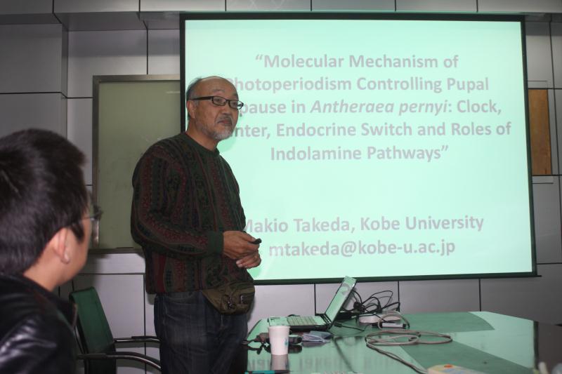 首先,何祝清工程师对竹田真木生教授及其学术内容做了大致的介绍,而后竹田真木生教授开始了他的讲座。教授先介绍了柞蚕(Antheraea pernyi)这种昆虫,并以短的光照时长诱导/保持滞育,而长的光照时长刺激化蛹这种现象来引出他的研究内容,即诱导和终止柞蚕蛹滞育的神经内分泌转换机制。这种现象的关键便是PTTH(促前胸腺激素)是否释放。教授通过一系列的证据展示了上游调控机制包含了吲哚胺调控通路:(1)光周期影响脑内5-羟色胺或褪黑激素的含量,(2)这些吲哚胺及其代谢酶共定位(3)注射褪黑激素能够终止蛹的滞育而luzindole(一种褪黑素受体拮抗剂)则能够保持蛹的滞育。光周期被认为是昼夜节律系统的一个功能。昼夜节律蛋白,PER,CLK,CYC的免疫组织化学反应(-ir)仅限于背外侧神经元,因此这些是昼夜节律神经元,与5-羟色胺受体,褪黑素受体和PTTH-ir并置。接着教授又用证据证明aaNAT能够调控这些基因。尤其是在加入NAT时,5-羟色胺含量随时间变化而不断降低,褪黑激素含量则随时间变化而不断升高,这时能够观察到PTTH的释放;当不存在NAT时,情况恰好相反。教授在这里用生动的语言进行了描述,PTTH的释放过程很像一个门控过程,NAT就像一把钥匙,能够打开门,从而引起PTTH的释放,因此在整个的通路过程中,NAT释十分关键的。随后教授又进一步阐述褪黑激素受体具有驱动Ca 2+动员的7-膜通过蛋白质,并且这些细胞具有PKC-和Rab8(小GPCR)-ir。Antheraea光周期系统的最后一个问题是“什么构成输入路径?竹田真木生教授通过RNAi研究了UVopsin,SWopsin和LWopsin,结果发现当注射SWopsin时,aaNAT转录遭到破坏,这表明SWopsin是光感受器。。最后,竹田真木生教授对整个的调控通路进行了总结,向我们展现了一个完整的诱导和终止柞蚕蛹滞育的神经内分泌转换通路。