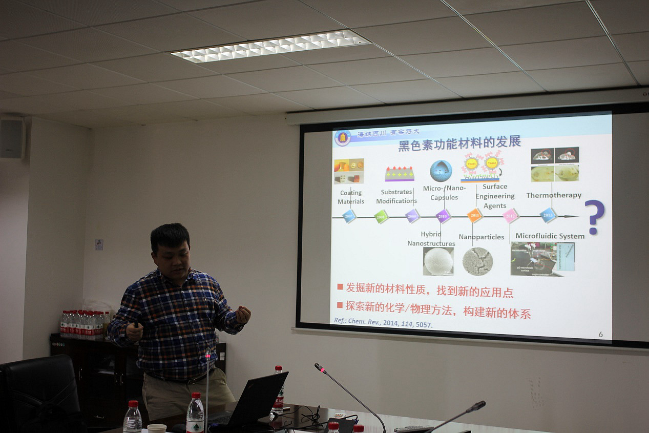 李乙文教授主要从事高分子杂化材料的精确合成及组装等方面的工作。在题为《人造黑色素功能材料》的报告中,李乙文教授展示了近年来人造黑色素功能材料的最新成果,介绍了其在模拟天然黑色素功能方面的数个代表工作,此外还对使用新的高分子化学方法来进一步改善人造黑色素的性质与功能进行了初步的探索和研究。