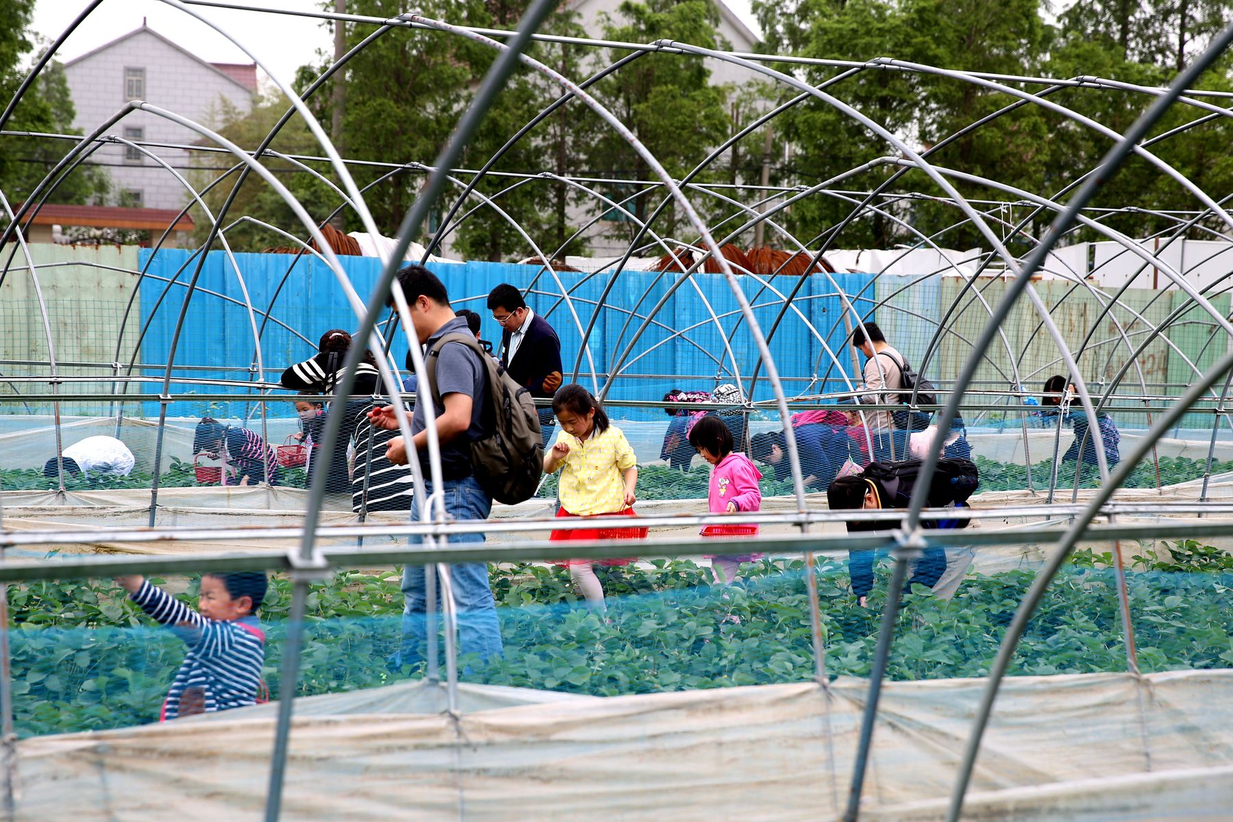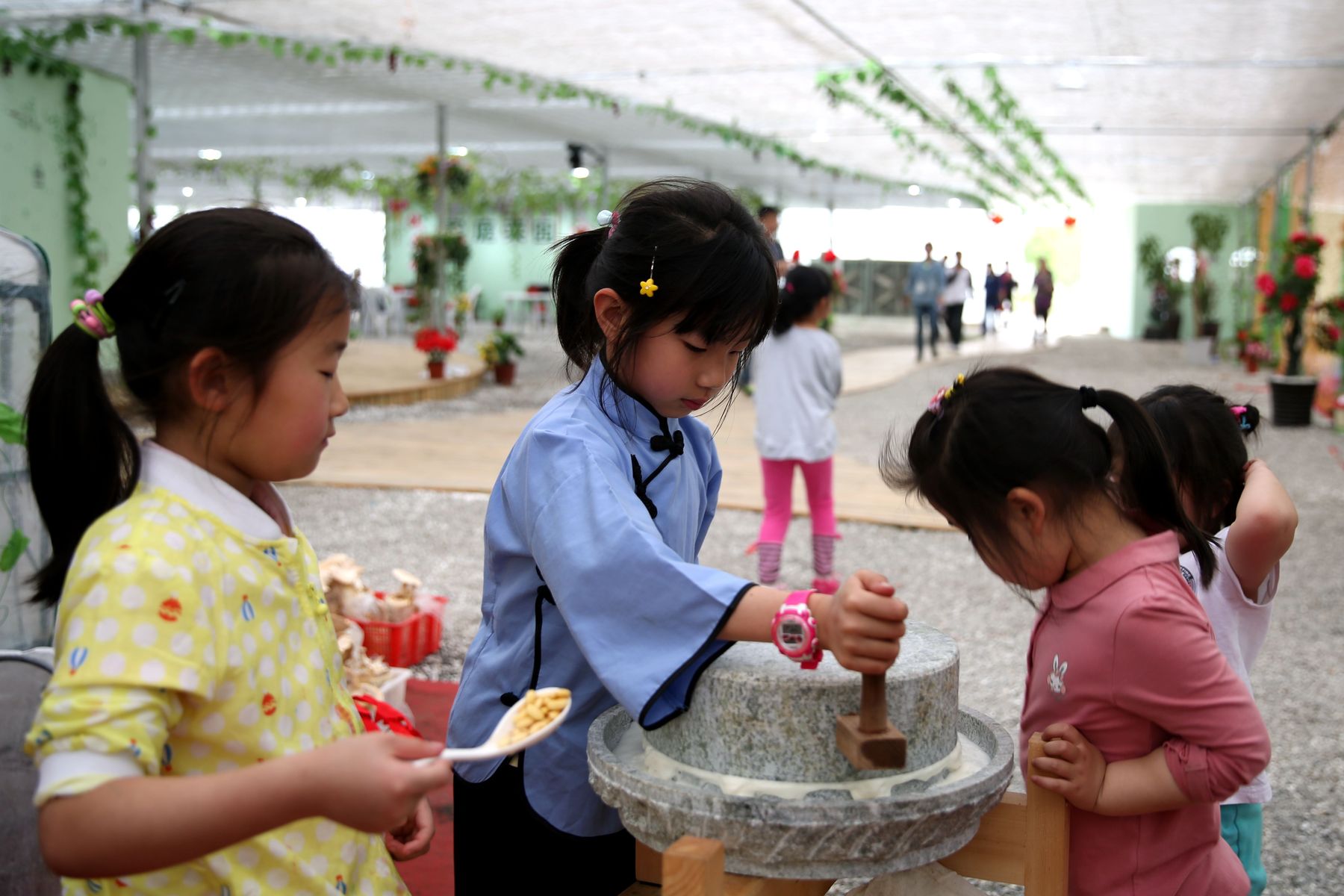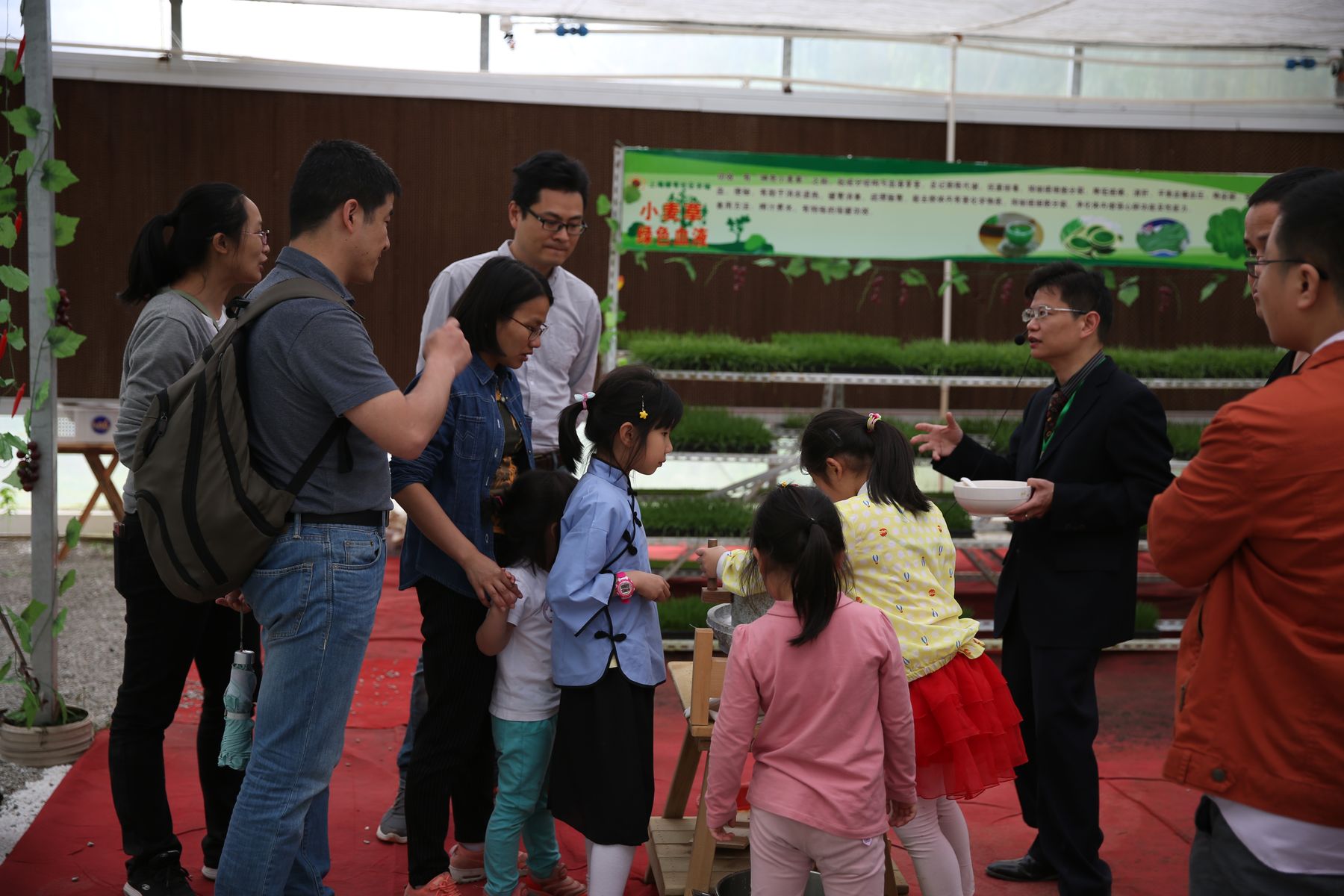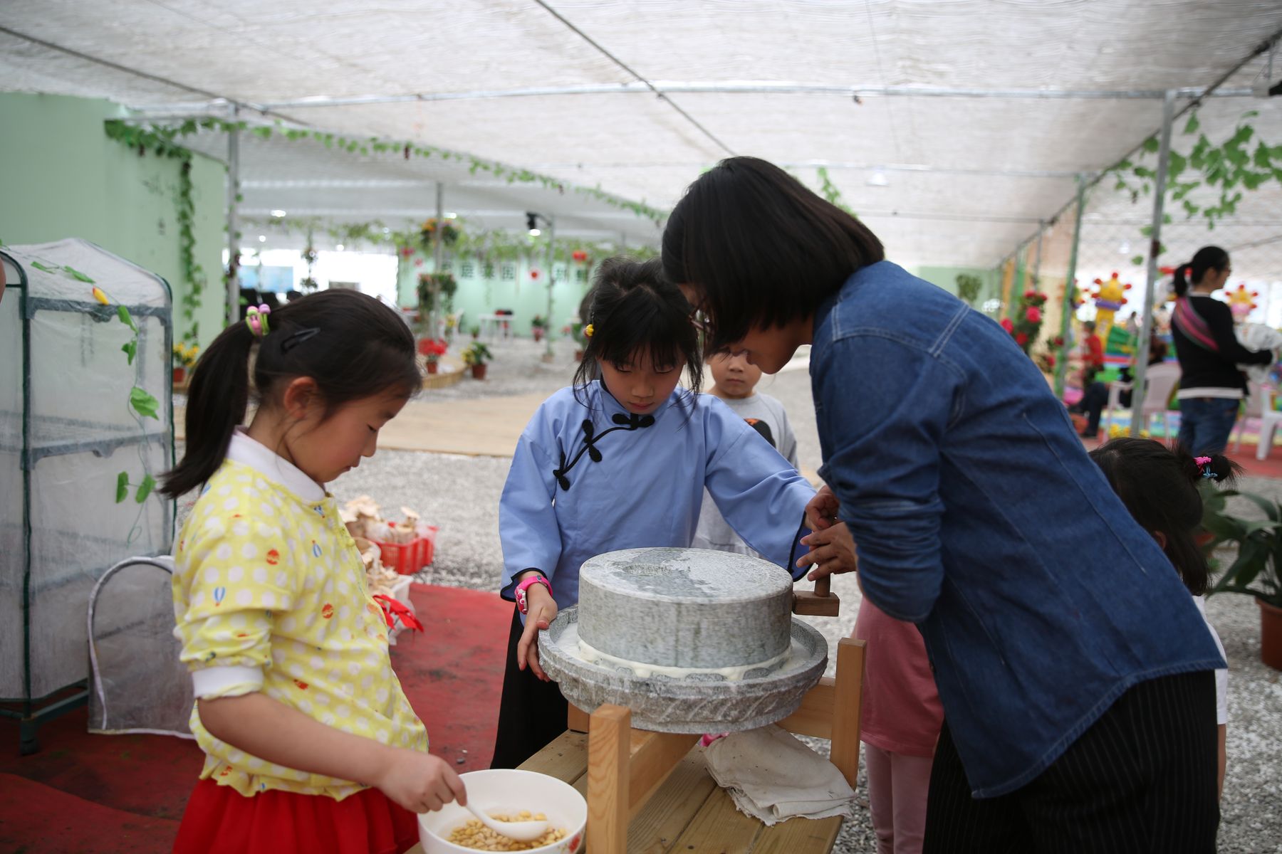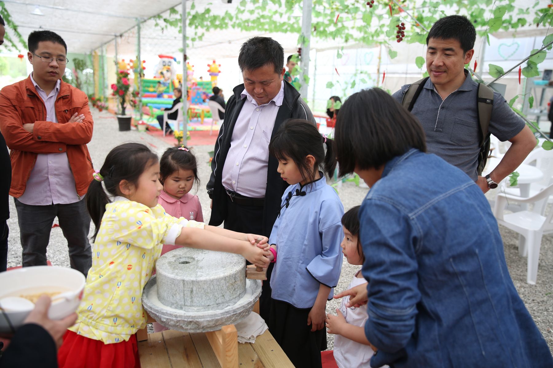 老师们、孩子们先游览了新场古镇,品尝了古镇特色小吃—草头饼。随后来到绿有家庭养生农场,在工作人员引导下参观了灵芝、北虫草和铁皮石斛的有机盆栽,品尝了小麦草茶;孩子们分组进行了采摘:有机草莓、黄瓜、茄子、辣椒和蘑菇等;之后还开心地体验了用手推石磨磨豆浆的过程,在玩乐的同时也学到了知识开拓了眼界。