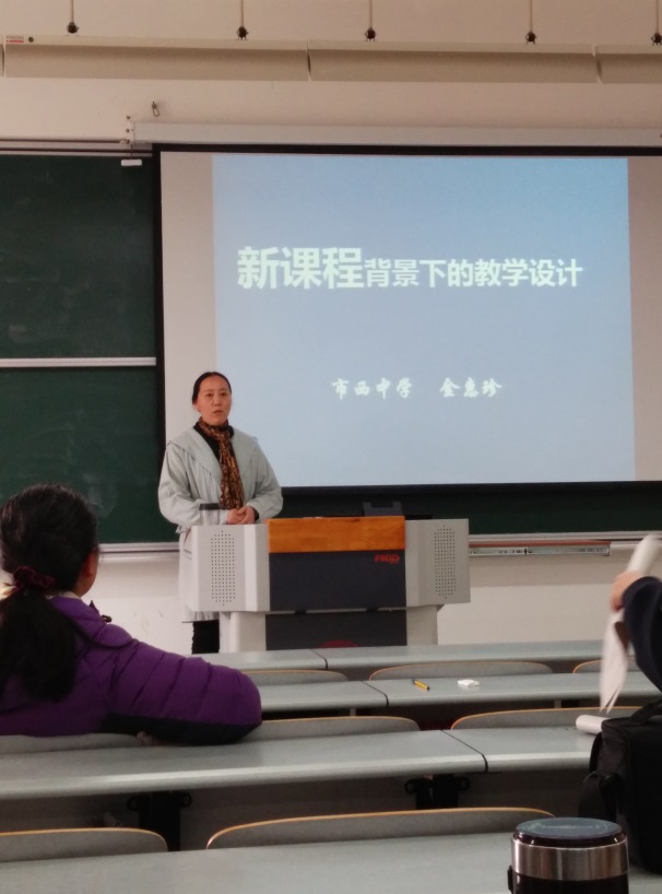 试讲评课活动结束后,金惠珍老师给大家带来了精彩讲座,主题是《新课程背景下的教学设计》。讲座围绕什么是新课程、新课程背景下教学设计的要求、教学设计中的指导思想、教学设计中的差异性表现等内容展开,通过一系列教学案例分析,充分体现了一位经验丰富的老教师对课堂教学的理解和卓越的教育思想。金老师强调,教学设计必须基于课程标准,并根据学生差异、地区差异、教师差异,才能做到好的教学设计,并以自己的课堂教学案例和全国说课比赛获奖者的教学设计为例,为同学们逐一分析如何进行教学设计。最后,同学们向金惠珍老师提出了许多教学方面的问题和困惑,金老师耐心地一一解答,让同学们获益匪浅。