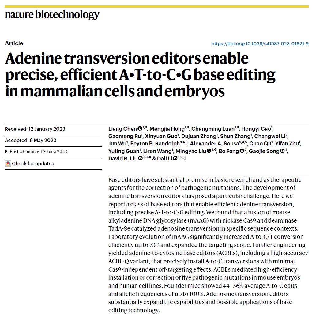 做爱视频 李大力教授团队继2022年10月在国际著名学术期刊 Nature Chemical Biology 报道新一代精准安全的腺嘌呤碱基编辑器ABE9以及11月在国际著名学术期刊 Nature Biotechnology 报道高精度新型胞嘧啶碱基编辑系统Td-BEs后,一年不到又迎来新的技术突破,2023年6月15日该团队再次在 Nature Biotechnology 上发表了题为“Adenine transversion editors enable precise, efficient A•T-to-C•G base editing in mammalian cells and embryos”的研究论文。