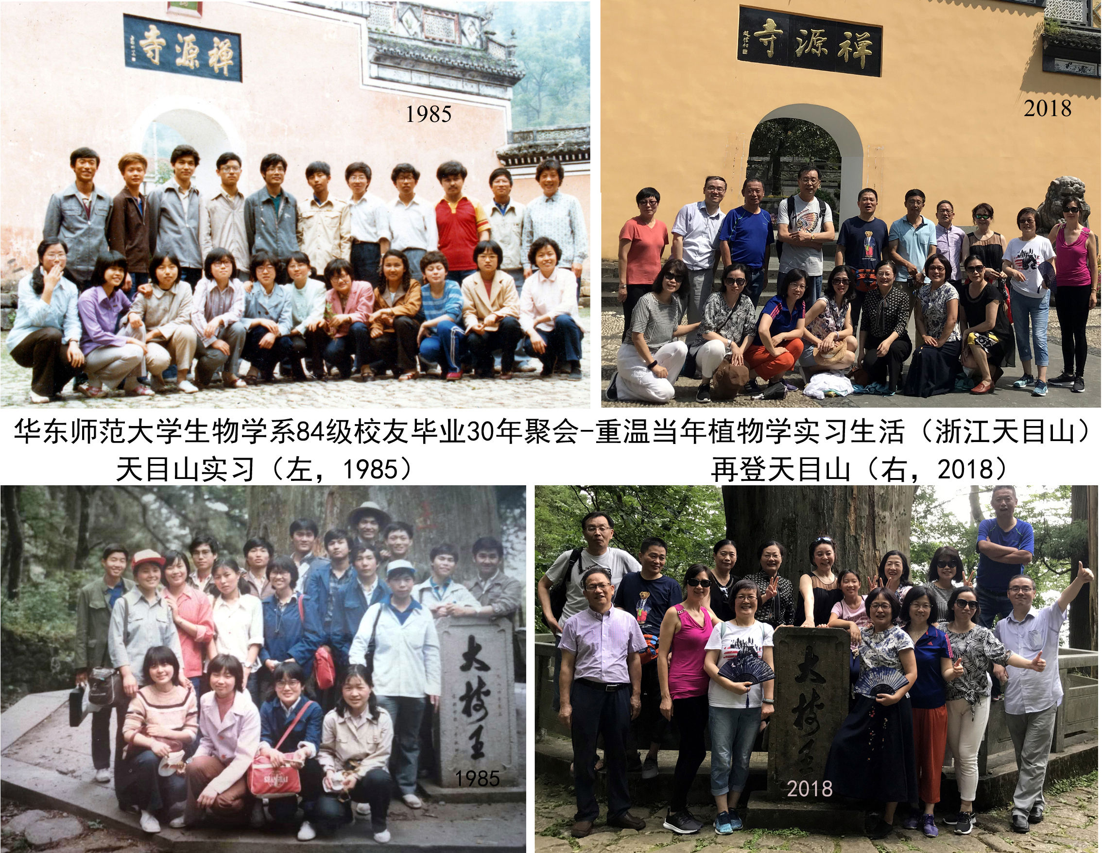 生物学系84级同学们在学习植物学时,曾在浙江天目山实习基地进行了为期近一个月的植物分类学实习(1985年)。2018年8月5日,返校的同学们奔赴浙江天目山,重温当年的实习生活,回顾实习时的趣闻轶事,并在禅源寺、大树王、开山老殿等当年留影的地方重拍照片。尽管大家都年逾50岁,但感觉“归来依然是少年”!