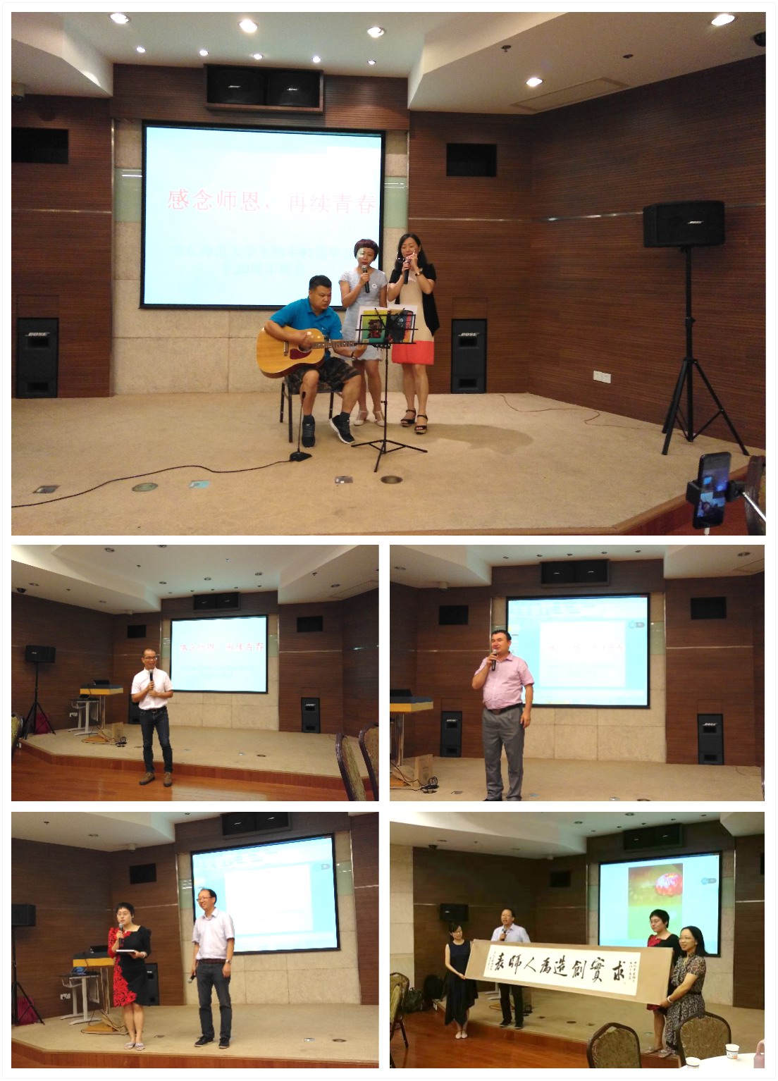 校友们也派出了汉族同学代表及新疆同学代表发言,并用老照片和吉他弹唱传递了二十年前结下的情谊。同学们纷纷表示:感念当年恩师的教导之恩,感念母校及母院的培育之恩,并祝母校及母院的发展欣欣向荣。同时校友们当场向学院赠送了其中一位校友的书法作品:求实创造、为人师表(我校校训)。